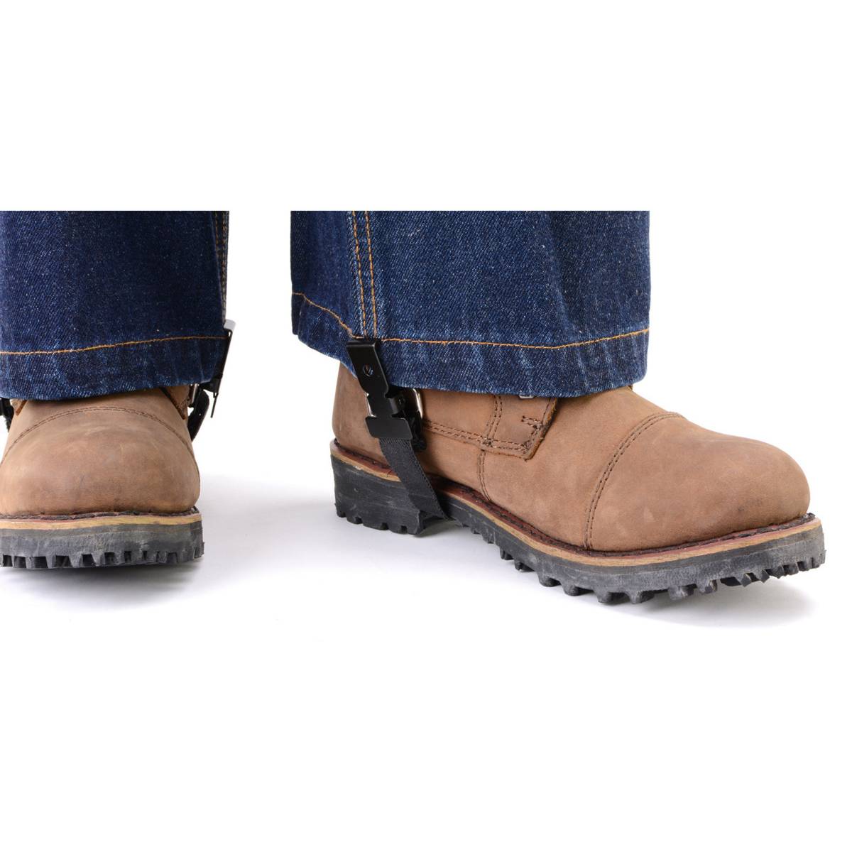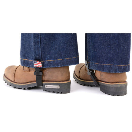 The Motorcycle USA Flag Pant Bungee Clips Measure 8 Inches Long and Can Be Used on Any Type of Pants or Chaps. These Adjustable Riding Pant Clips Are Made of Black Stretchable Bungee Material and Silver Heavy-Duty Clips with a USA Flag Emblem. Use These Clips to Keep Your Pant Legs Down and Prevent Wind and Debris from Going Up Your Legs While Your Ride!
