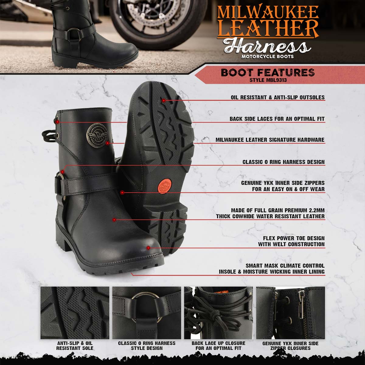 • Inside Zipper Closure with Adjustable Back Laces | These classic motorcycle boots for women feature a secure closure system with an inside side zipper for easy on and off wear, allowing you to easily put them on and ensure a secure fit for a confident bike ride. Adjustable back laces for an optimal snug fit. The women's riding boots boast the industry’s best YKK hardware, bearing Milwaukee’s Leather signature logo, along with a classic O-ring design.