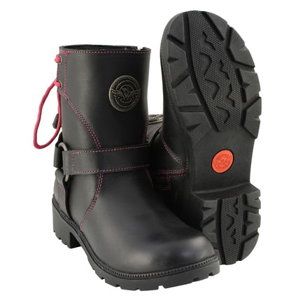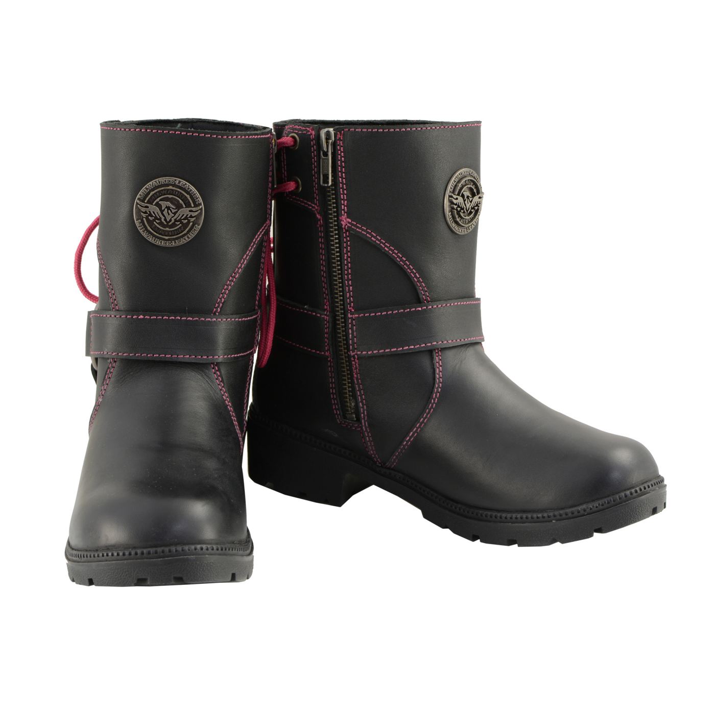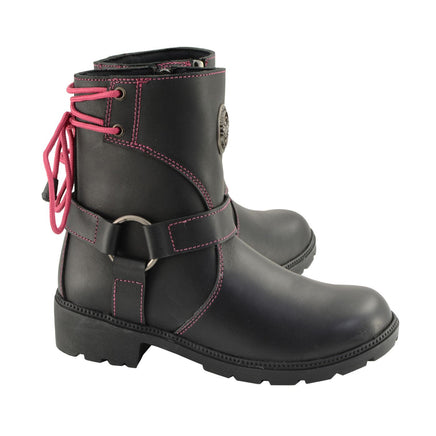 Milwaukee Leather MBL9318 Women's Black Leather Harness Zip-Up Motorcycle Rider Boots w/ Pink Back Laces