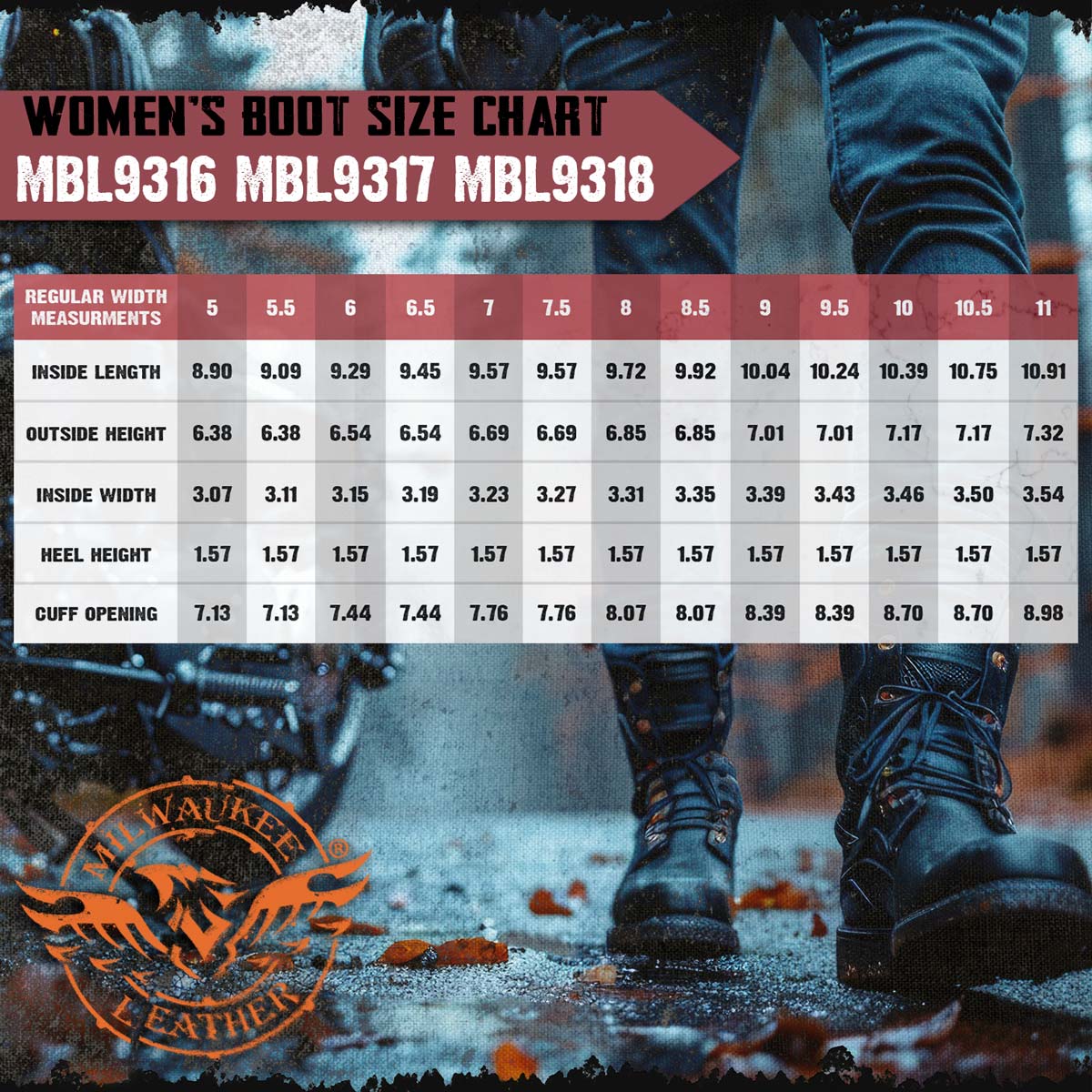 • Footwear Sizes | Our motorcycle boots for women are well-constructed and are offered in various sizes. Milwaukee Leather: Made for Riders, Built to Last!