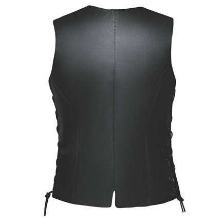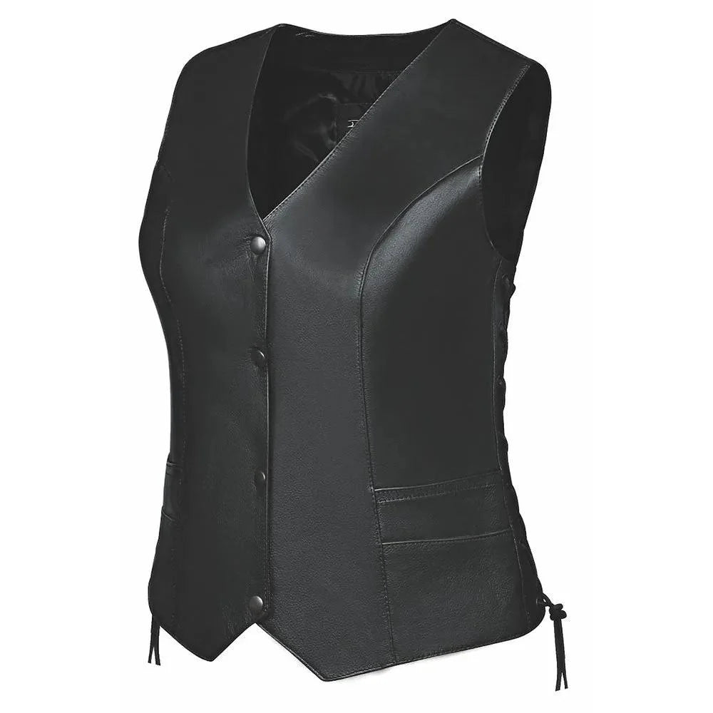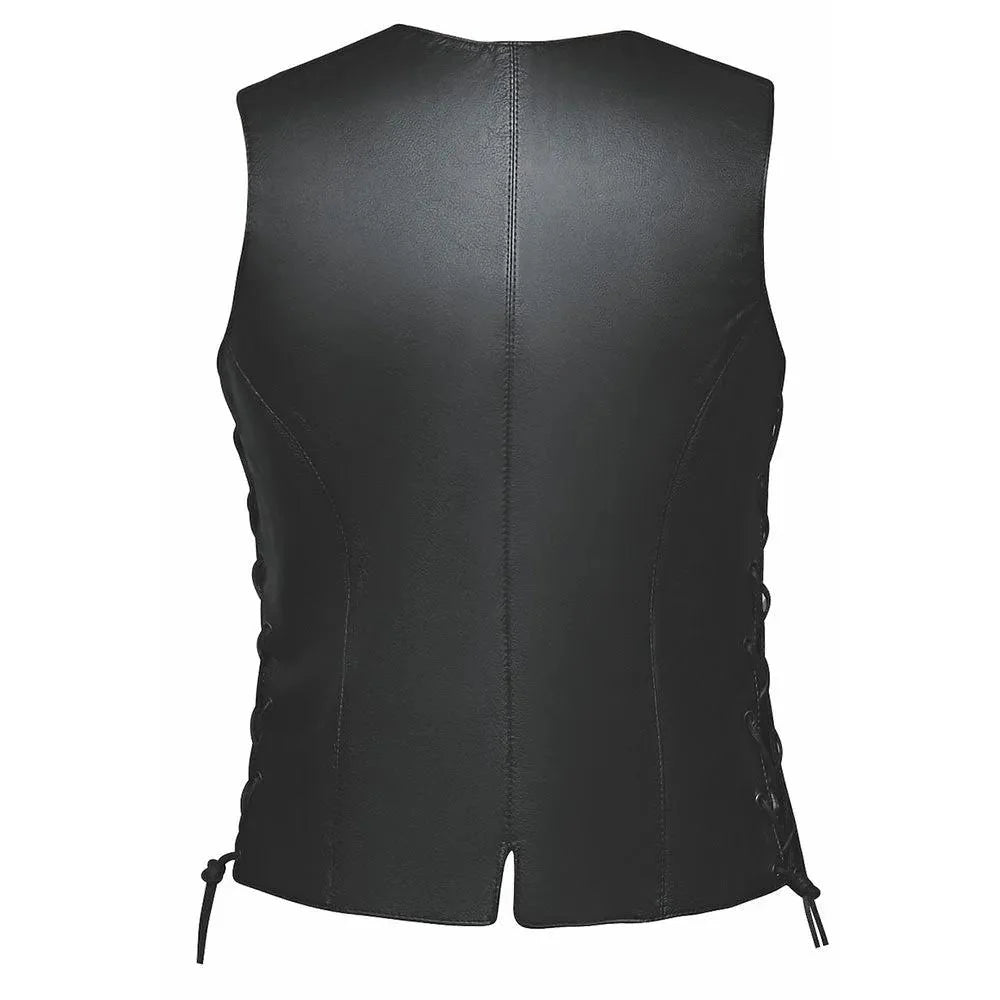 This Ladies vest offers a blend of classic design and practical features tailored specifically for women. With cowhide leather construction, two exterior pockets, two interior concealed carry pockets, side laces for adjustability, a snap front closure, black hardware,