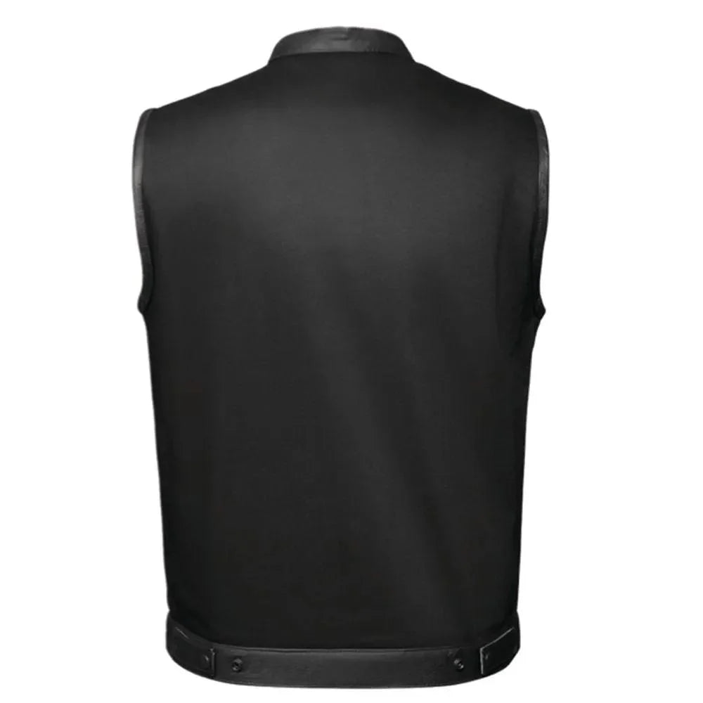 The Men's Denim matt black club vest with leather trim by Unik Denim blends cotton and cowhide leather in a matt black finish, featuring leather trim accents. With four exterior pockets, two inside concealed carry pockets, a one-panel back, lined interior, zip snap front closure, antique silver hardware, this vest offers practicality and a contemporary aesthetic for motorcycle enthusiasts and urban adventurers.