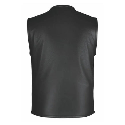 The Men's Naked Cowhide Leather Vest offers durability and style in equal measure. Made from cowhide leather, it features two outside chest pockets, two hand warmer pockets, two inside concealed carry pockets, a front zipper closure, black hardware, and a one-panel back, providing practicality and a timeless aesthetic.