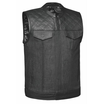 The Men's Denim / Leather Club Vest offers a stylish fusion of cowhide leather and denim. Featuring four exterior pockets, two inside concealed carry pockets, a zip snap main closure, antique brass hardware, and a one-panel back, this vest provides both practicality and unique aesthetic appeal.