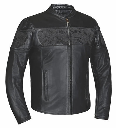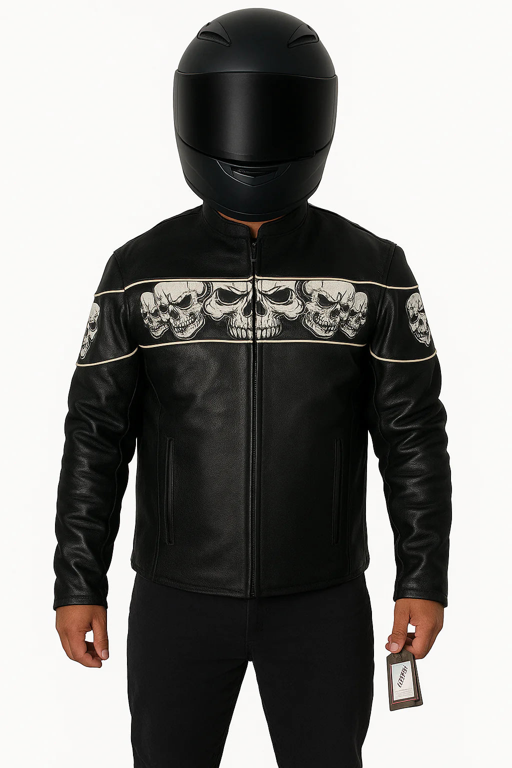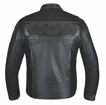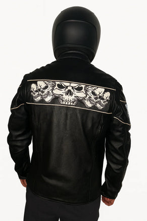Make a bold statement with the Style # 6916.00 Men's Premium Leather Jacket. Crafted from premium cowhide leather and featuring a distinctive reflective skull design, this jacket combines rugged style with advanced functionality, perfect for motorcycle enthusiasts and urban adventurers. Stand out with confidence and style designed to deliver both exceptional protection and distinctive fashion for riders who demand both style and functionality.