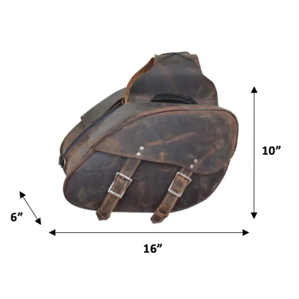 Style # 9352.ZP features a hard leather saddle bag made from cowhide leather in distressed brown. It offers compact dimensions with ample storage space, sturdy construction, and classic design suitable for motorcycle enthusiasts.