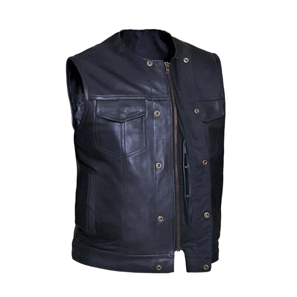 The Men's PREMIUM SOA Style Club Vest merges rugged durability with iconic style. Featuring cowhide leather construction, a classic black color, four exterior pockets, two inside concealed carry pockets, zip snap main closure, antique brass hardware, and a focus on comfort, this vest is ideal for those who appreciate both functionality and distinctive fashion.