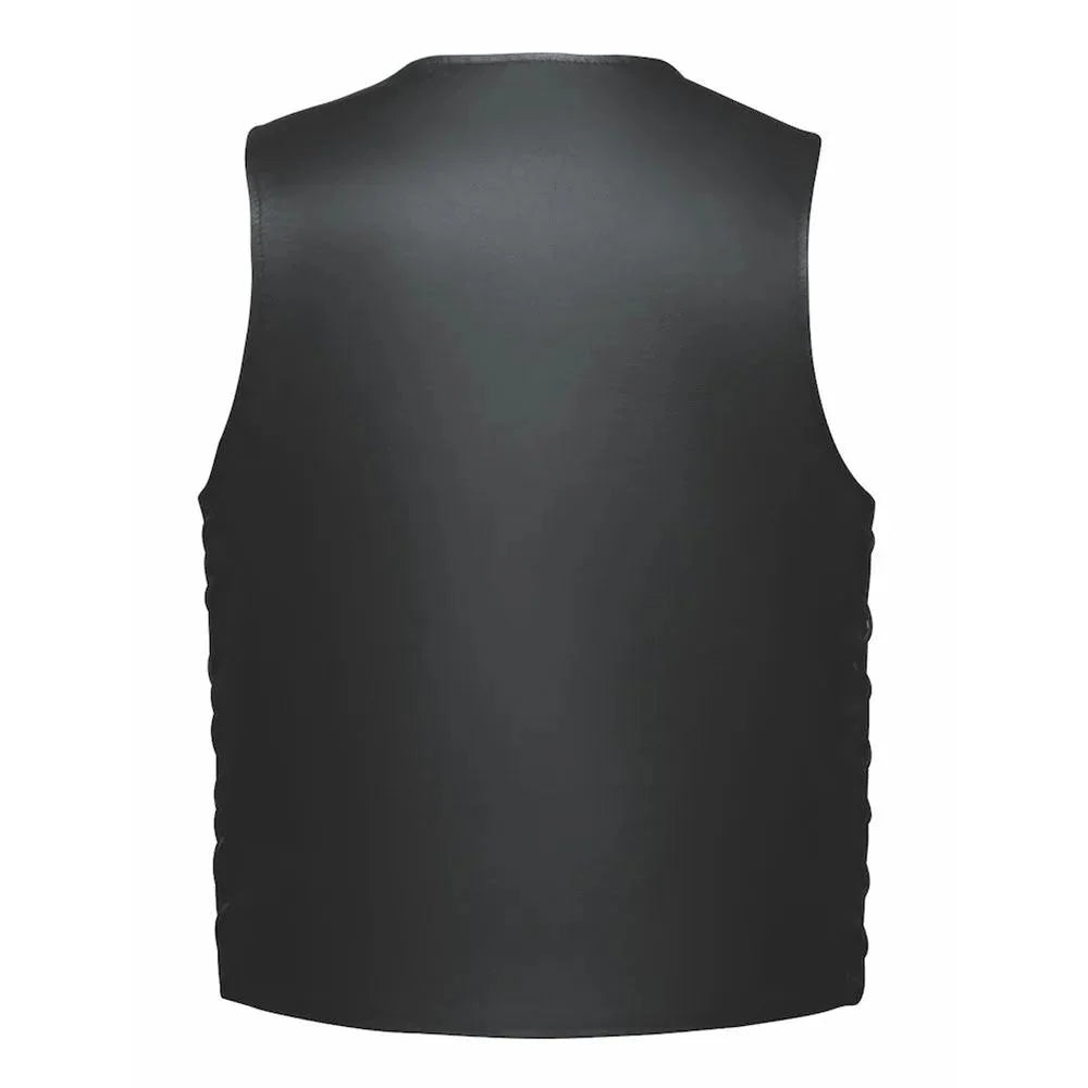 The Men's Premium Traditional Snap Front Vest. Made from cowhide leather, it includes two exterior pockets, two interior concealed carry pockets, black hardware for a polished appearance, and side laces for adjustability, making it suitable for various occasions.
