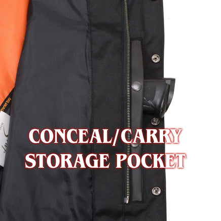 - Pockets | This biker vest is designed with concealed and carry 2 pockets (can be used as regular storage pockets). It features strategically placed pockets with secure closures, allowing you to discreetly carry while maintaining a sleek and stylish look. Our vest includes 2 front chest pockets w/ flaps, 2 outside lower slit drop handwarmer pockets with concealed snap, 1 inside media pocket for phone, 1 extra inside zipper pocket enabling you to securely store and easily access small items like keys and wallets.