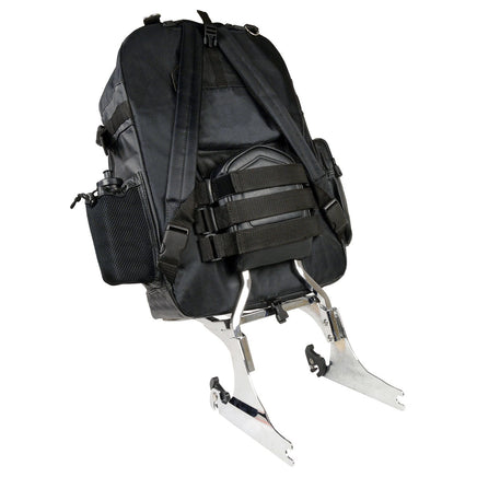 Access Whatever You Need While You Ride with This Large Leather and Nylon Sissy Bar Backpack. This Bag is made of Durable Premium Leather and 1220D Textile Construction. Included a Waterproof Rain Cover to Keep Your Belongings Safe Through Almost Any Conditions. Easily Mount the Bag and Get Convenient Access to Your Belongings with Multiple Outside Zippered Pockets as Well as a Side Water Bottle Holder and Bottle. The Bag Also Features an Inside Conceal and Carry Storage Pocket, So You Can Feel Safe Wherever You Ride.